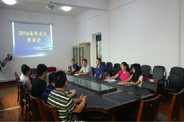 新闻网讯(通讯员 王琪瑛)2016年6月21日,材料科学与工程学院在学院五楼会议室召开2016届毕业生座谈会,副院长于燕、党委副书记吴文东、副院长刘耀东、各系主任、党支部书记、毕业班辅导员万杨以及部分老师、毕业生代表分别参加了座谈会。