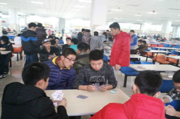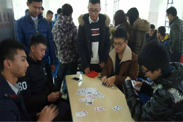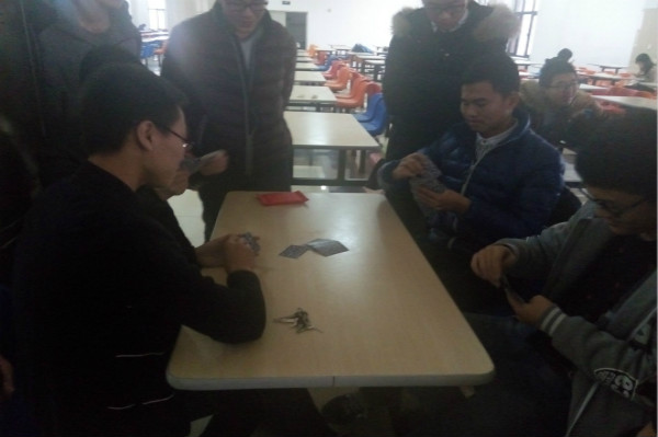 中午11点20活动正式开始。首先由体育部学长宣读比赛细则,并让选手抽签分组。比赛采用回合积分制斗地主7个班共21人参赛,刨幺共12人参赛。同学们斗志昂扬,磨拳擦掌。第一轮比赛结束,斗地主共7人晋级,刨幺共3个班级晋级,第二轮,斗地主仅3人晋级,刨幺两个班晋级,最终,来自二班的贾剑明同学获得了斗地主第一名,六班获得刨幺第一名。比赛结束后还有一些观战的同学玩心大起自发组织其他娱乐项目,增进了同学间的友谊。