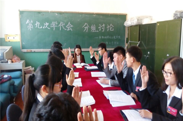 首先会议对学代会中学校领导的三个报告进行讨论,各个参会人员积极发言、发表意见。其中,陈宇畅指出,学院工作在大力推进学校要求的同时要结合本院实际情况。形成自己特色的章程制度。学院管理制度化、合理化最终才能做到“引领青年新风尚,汇聚青春正能量”。随后对第九次学代会主席团、秘书团的建议名单进行表决决议。通过审议及举手表决,材料科学与工程学院代表团对正式会议中四项内容表示一致同意。最终陈宇畅代表材料全体参会人员祝贺长春工业大学第九届学生代表大会圆满结束。