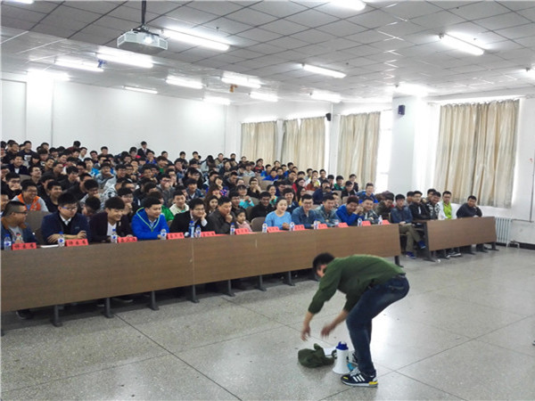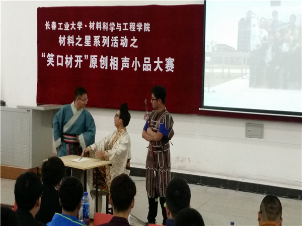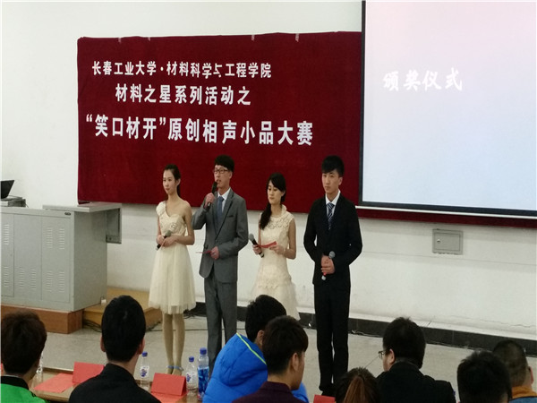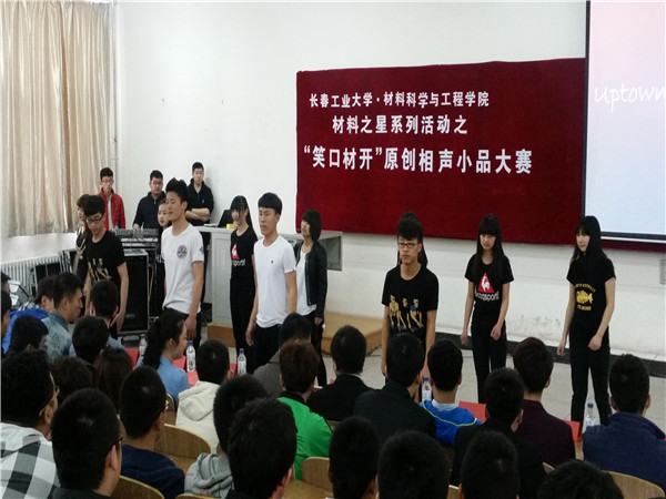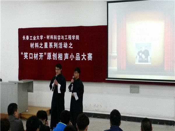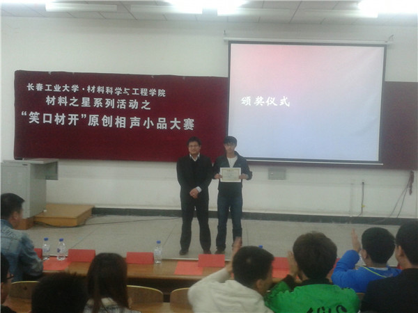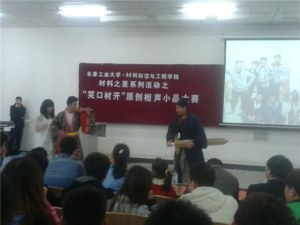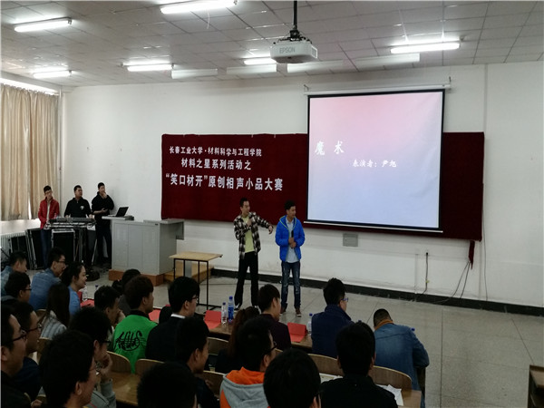 新闻网讯(通讯员:刘谦)为了进一步活跃校园文化,丰富大学校园生活。2015年4月18日,由材料科学与工程学院大学生艺术团主办的材料之星系列活动之“笑口材开”原创相声小品大赛在西阶102室举行。团委书记邹绍岩、党支部书记万杨、团委副书记吕卓颖、学生会主席付强、社团联合会主席张庆国、生活委员会主席王超、团委常委蔡佳龙、13级主要学生干部及14级全体学生观看比赛。