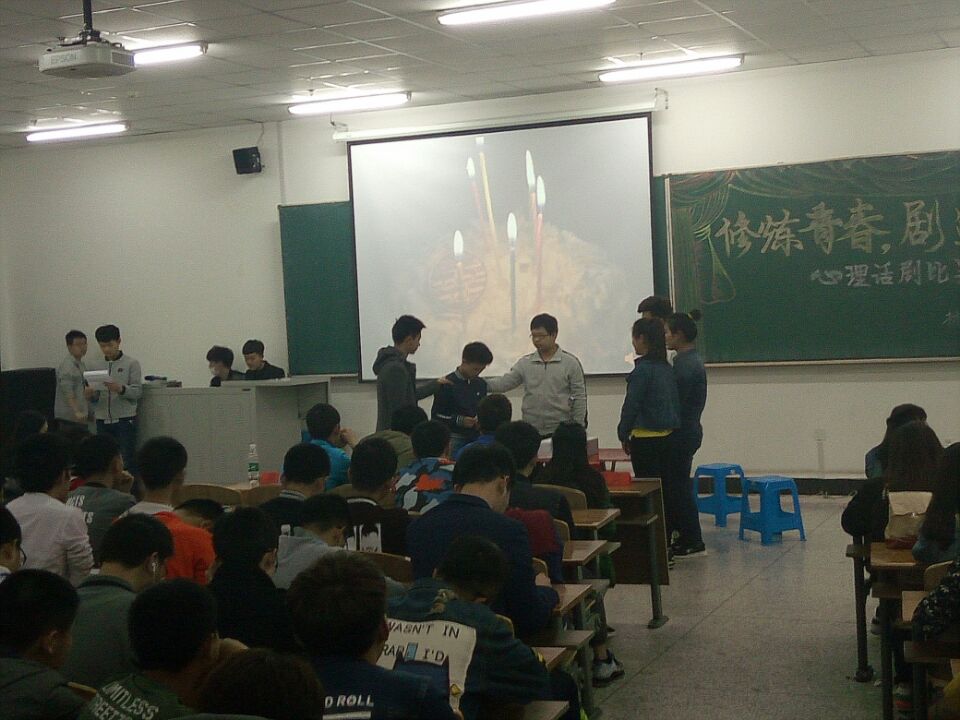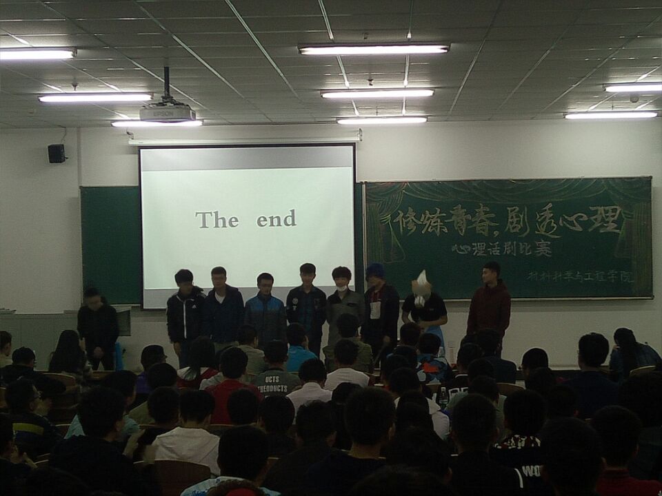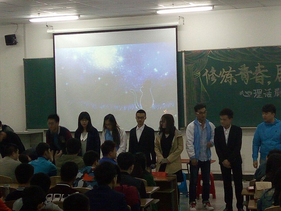 首先主持人介绍今晚到场的嘉宾。本次活动的到场嘉宾有学生会主席袁佳志,副主席路旭,网讯部部长张德旭及其他学生会主要成员。随后后袁佳志宣读比赛评分细则。本次比赛共有7组。同学们通过观看反映自己或他人在校园生活中遇到的冲突、烦恼的话剧,将其与应当受到的心理健康教育融为一剧,寓教于剧。精彩的话剧表演赢来了同学的热烈掌声。《小幸运》,《天天情人节》更是将现场的气氛推向高潮。四班的《我的青春》话剧以最高成绩荣获第一名,五班《误会无悔》及七班《都是游戏惹的祸》获二等奖。一,二,三,六班的话剧获三等奖。袁佳志为获奖同学颁奖合照留念。最后主持人宣布心理话剧圆满结束。