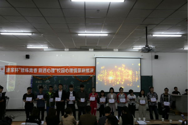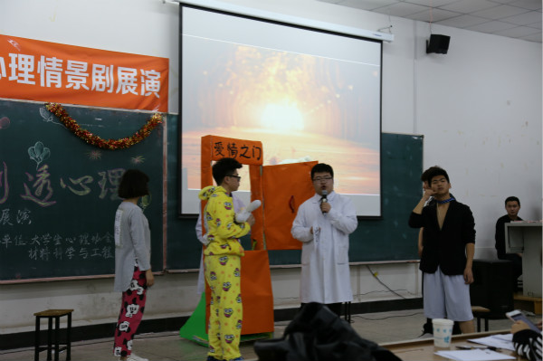 伴随着热烈的掌声,在一段激情澎湃,活力四射的“Dream”舞蹈之后,”修炼青春,剧透心理”心理话剧展演活动正式拉开帷幕。接着,全校十二个学院以及大学生心理协会为大家表演了十六个话剧及歌曲。这些心理剧中,人文学院的《那些迟来的青春》、机电工程学院的《正青春,有你陪,不后悔》、信息传播工程学院的《原来爱一直在》讲述了大学生由于某些原因而没处理好寝室关系,造成的一系列影响;电气与电子工程学院的《惊鸿一梦》、化学与生命科学学院的《仰望》演绎了大学生沉迷网络、沉迷手机而忽视学习、忽视身边人的情况;经济管理学院《最初的梦想》则另辟蹊径,把话剧社从成立到现在的幕后故事搬到了台上;基础科学学院的《逐梦青春》讲述了大学生做事没决心没毅力;化学工程学院的《我一定能行》讲述了一个农村大学生四处碰壁,内心封闭矛盾的事例;外国语学院的《雨季》让我们回味了一下高中生活;大学生心理协会的《释怀过去,把握现在》则展现了生活在家暴下的女大学在教授朋友的引导下如何摆脱心理阴影追寻人生目标的过程;材料科学与工程学院的《迷茫的我》、国际教育学院的《变形记》、艺术设计与纺织服装学院的《餐桌》都展现了大学生成长蜕变的过程;最后出场的材料科学与工程学院的《爱情疯人院》给我们讲述了一个道理---放心爱情,为本次展演活动画上了一个完美的句号。