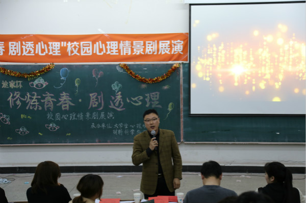 新闻网讯(通讯员王琪瑛)为了在校园内营造一种热爱生命、感恩生活的氛围,在宣传普及心理健康知识的同时为学生搭建起锻炼心理品质、提升心理素质的平台,全方位地加强我校大学生的心理健康教育水平,由我校学生工作处心理健康教育与咨询中心主办,材料科学与工程学院与校大学生心理协会共同承办的“修炼青春,剧透心理”校园心理剧主题演出活动于5月12日在北湖校区西阶102教室隆重举行。出席本次活动的评委及嘉宾有化学工程学院党委副书记曹永利、化学与生命科学学院团委书记季宏伟、材料科学与工程学院团委书记邹绍岩、电气与电子工程学院团委书记赵爽、机电工程学院学生党支部书记杨楠、经济管理学院学生党支部书记郭方兴,以及各学院辅导员助理王琳华、曲悦、赵子玉、李晓涵、李彤、王子灿、王丽、程琳。